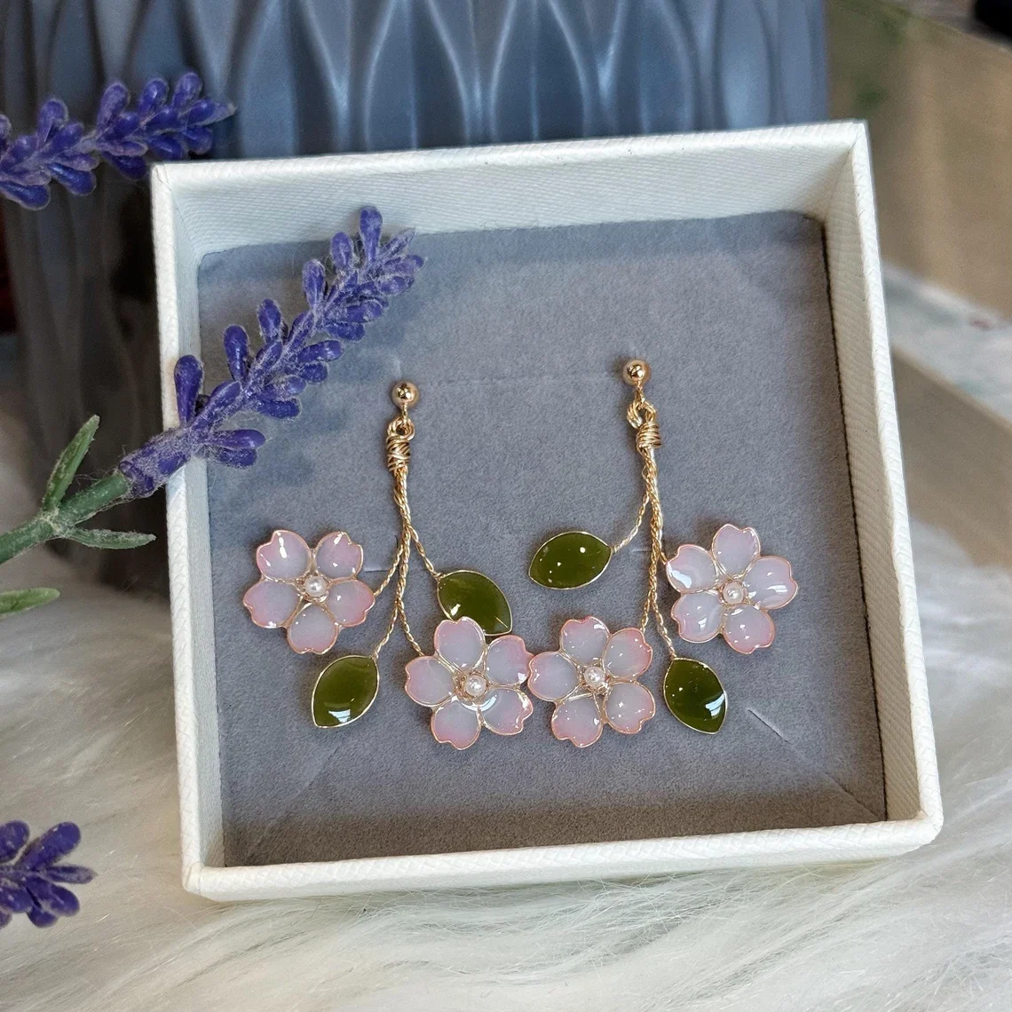 Cherry Blossom & Green Leaf Resin Stud Earrings – Handmade Floral Jewelry