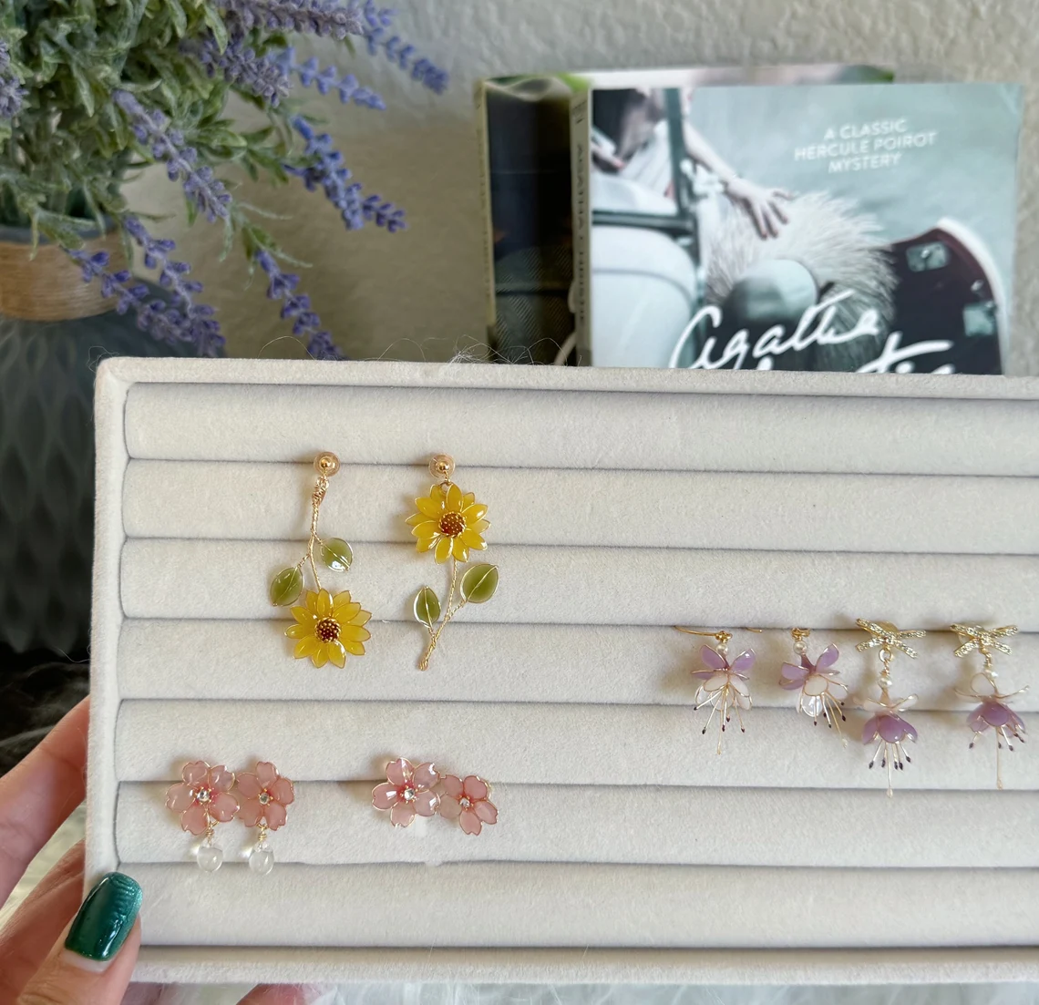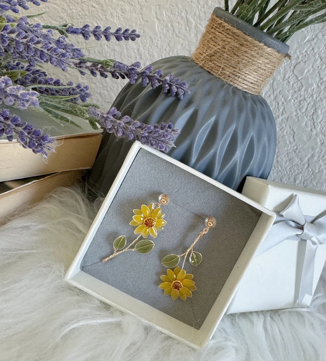 What sets these earrings apart is their charming asymmetry: one earring features a sunflower facing upwards, radiating warmth and vitality, while the other boasts a sunflower facing downwards, symbolizing resilience and growth. This unique design adds an element of whimsy and personality to your look, allowing you to express your individuality with style.