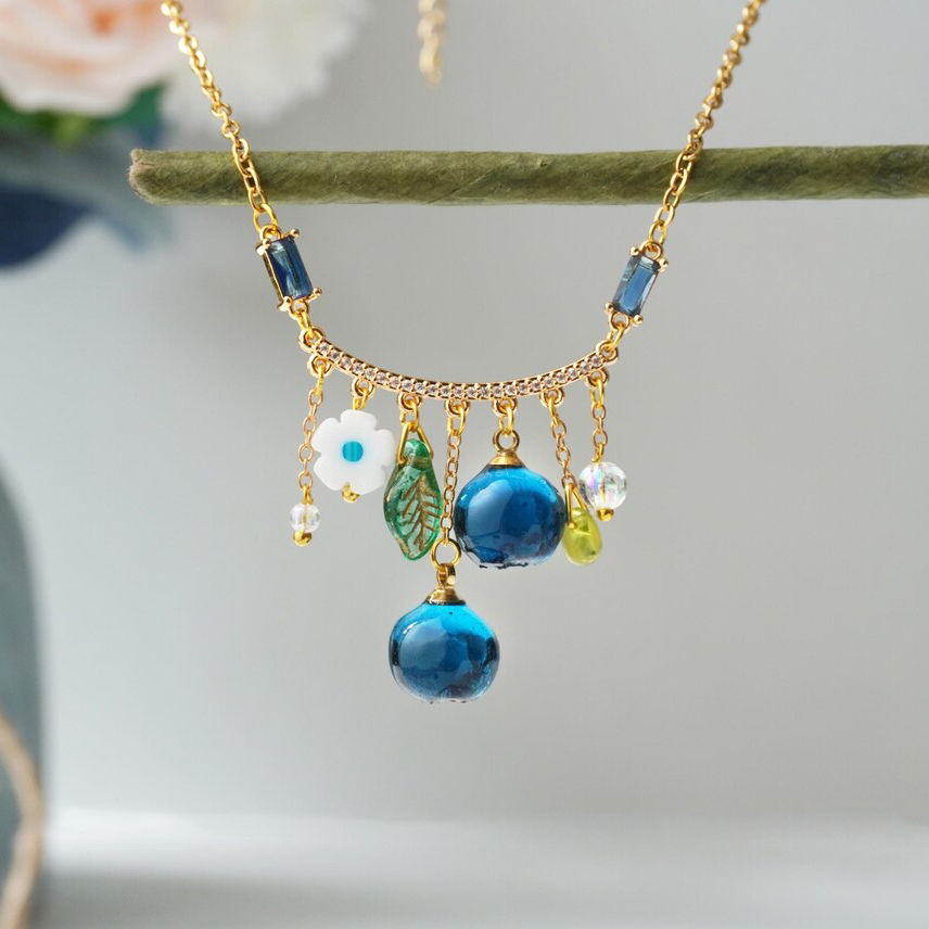Add a sweet and whimsical touch to your style with this handcrafted resin blueberry necklace. Featuring two blueberries, the design is delicately accented with a white flower, small decorative beads, and green leaf details — like a little garden captured in jewelry form。