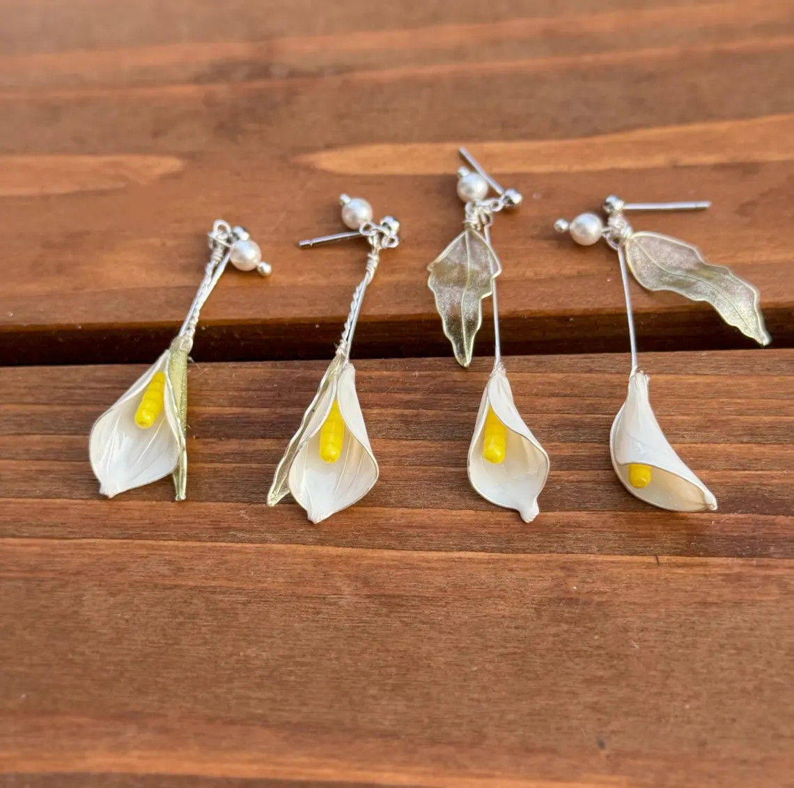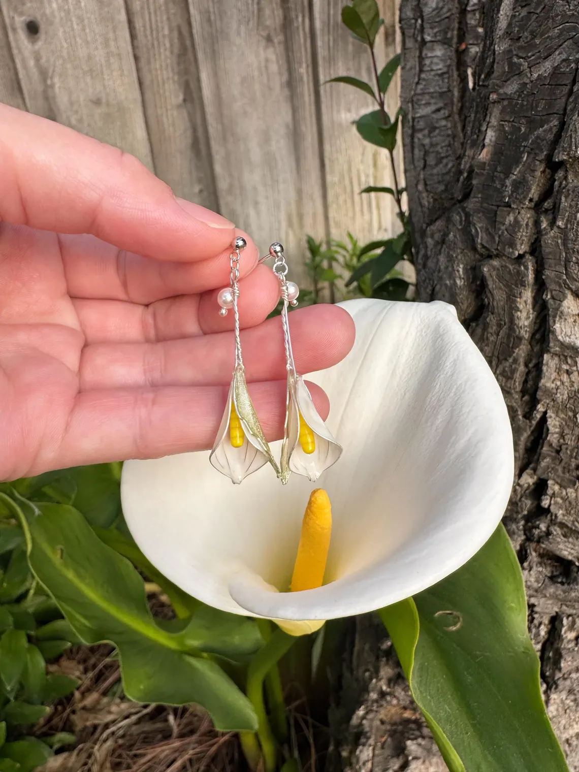🍃 Each earring features a graceful white Calla Lily bloom with a tiny pearl accent and a transparent green leaf.
