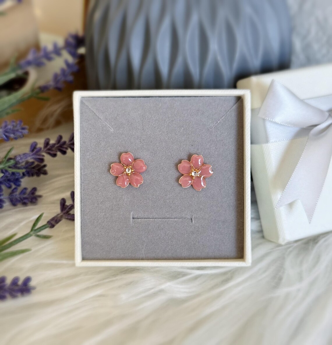 Measuring just 0.5 inches in width, these dainty studs add a touch of elegance to any ensemble. The delicate pink hues of the cherry blossoms evoke the ephemeral beauty of springtime, while the glossy finish enhances their enchanting allure.