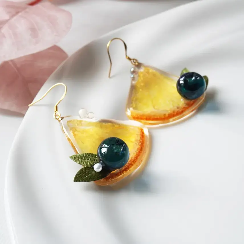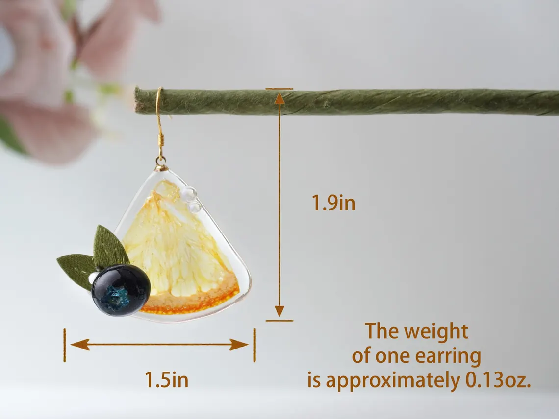 Bring a burst of fruity charm to your look with these handmade resin earrings! Each earring features a quarter orange slice, accented with a tiny resin blueberry and two delicate green leaves, creating a playful and colorful design that’s perfect for fruit lovers and whimsical fashion enthusiasts.